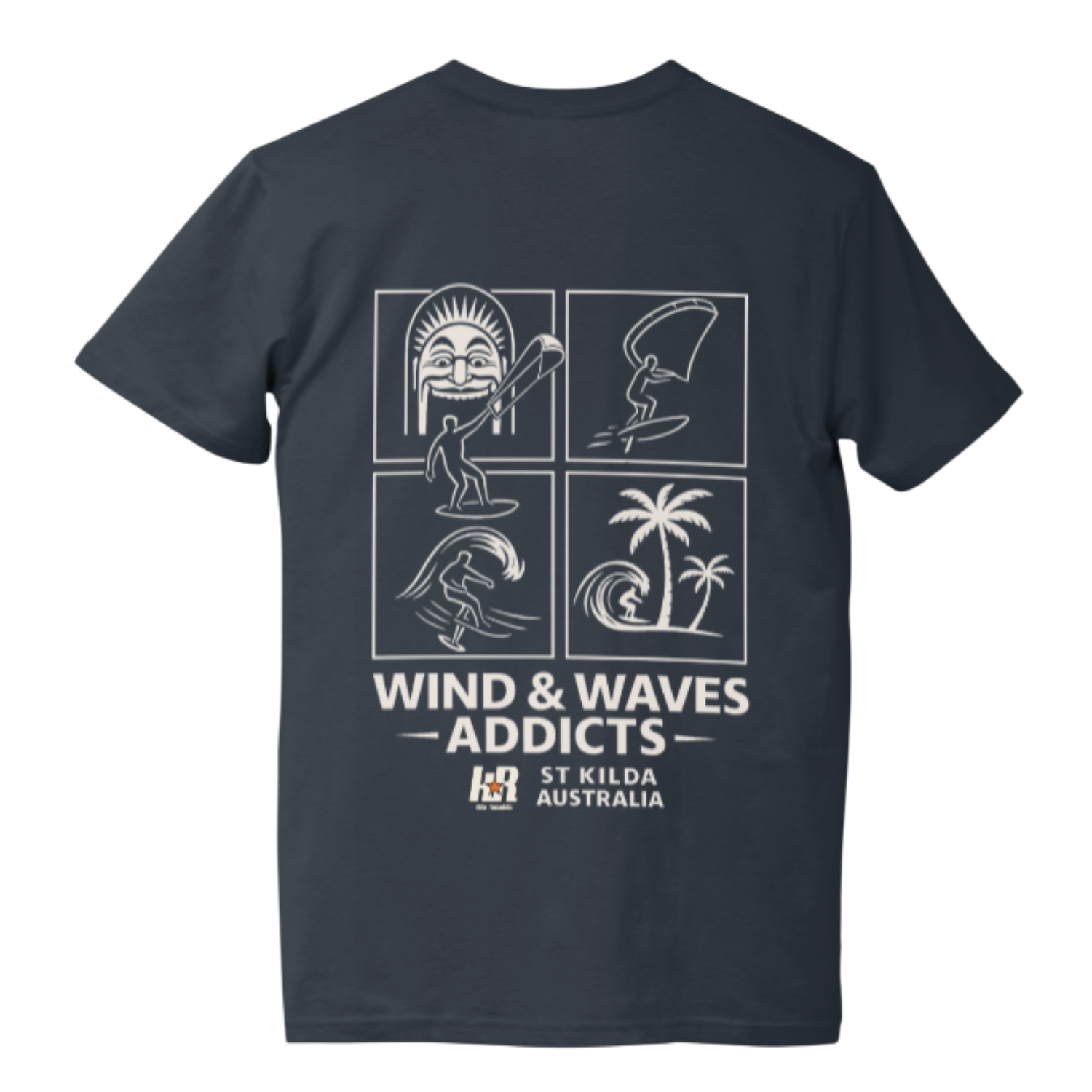 - Iconic Wind & Waves Addicts back print featuring kite, surf, foil, and tropical designs inspired by St Kilda’s coastline.